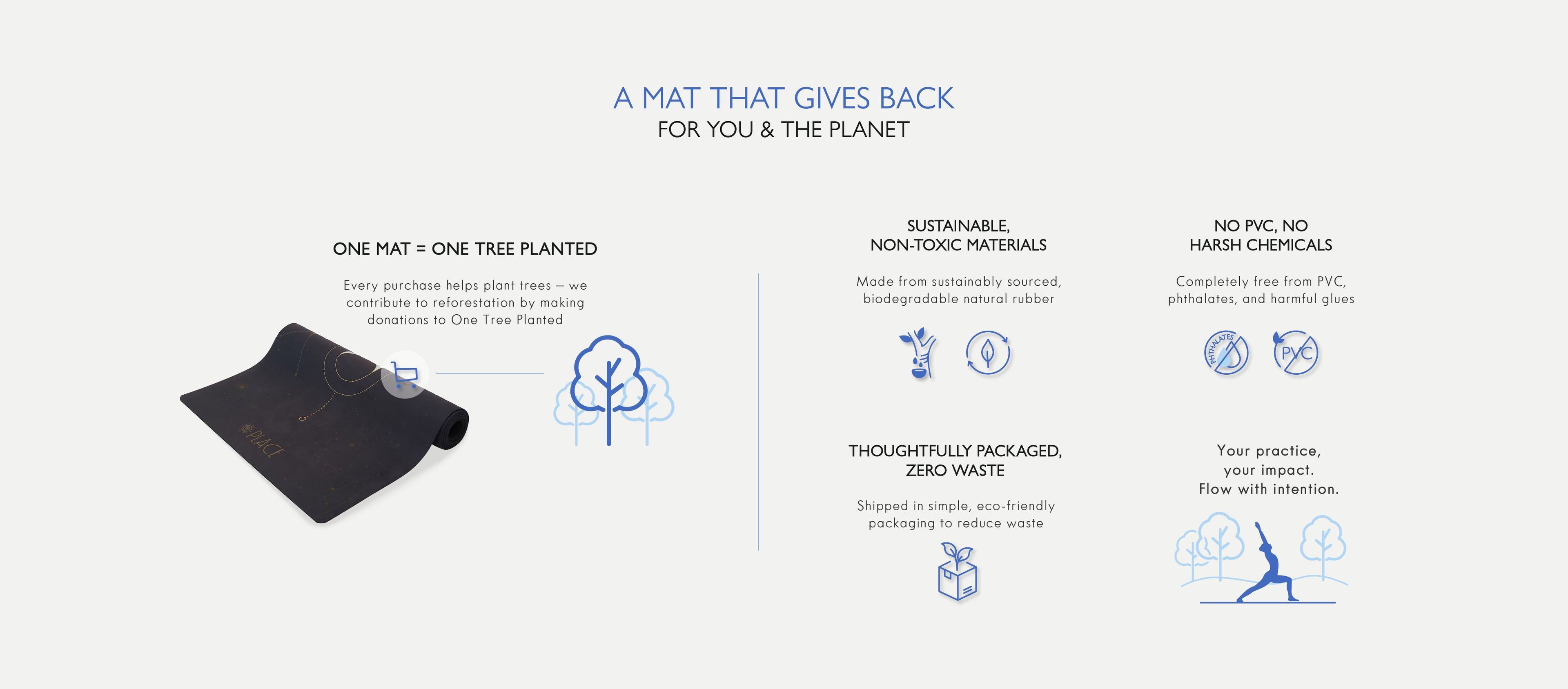 We offer a 30-day return policy for unused mats in their original packaging. If you need to return your mat, simply email us at support@place.yoga, and we’ll assist you with the return process.